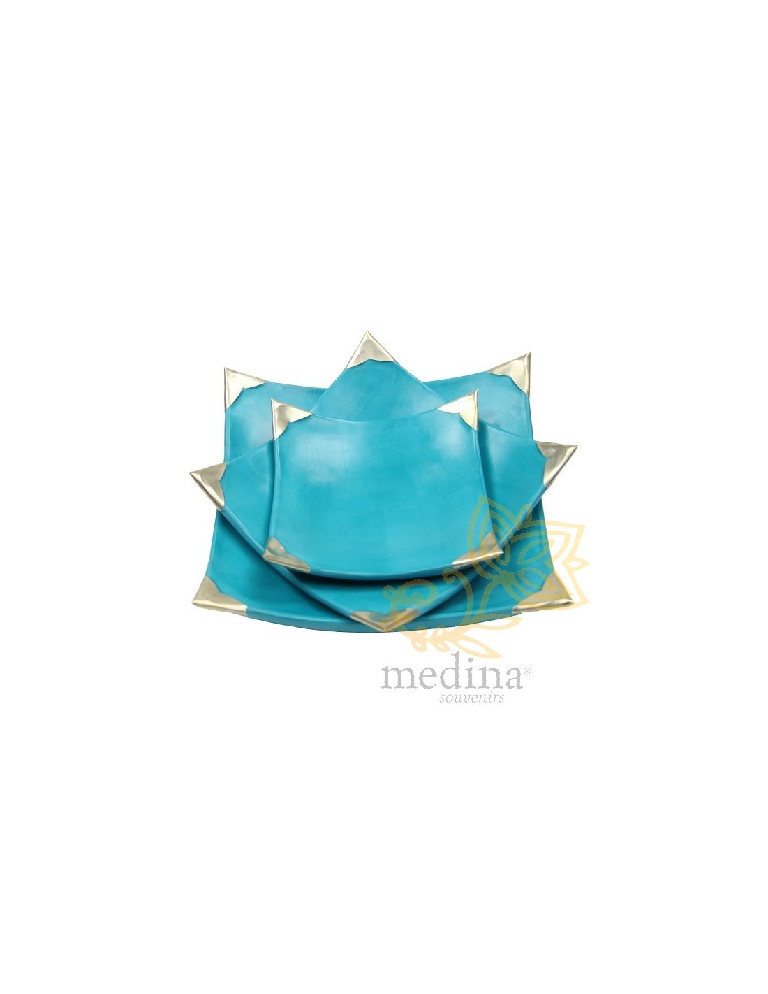 Ensemble de trois belles assiettes décoratives carrées et creuses (petite, moyenne et grande). Fabriquées en tadelakt , ornées de maillechort aux coins. Le tadelakt est un revêtement traditionnel et écologique d?apparence fine et satinée à base d'argile.