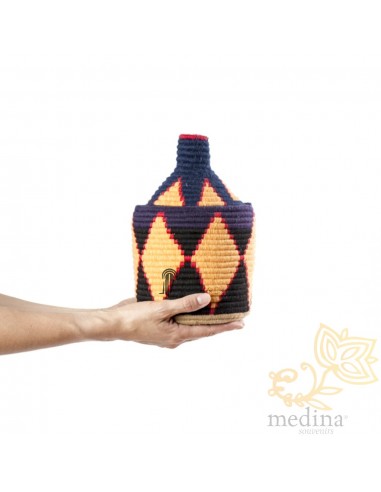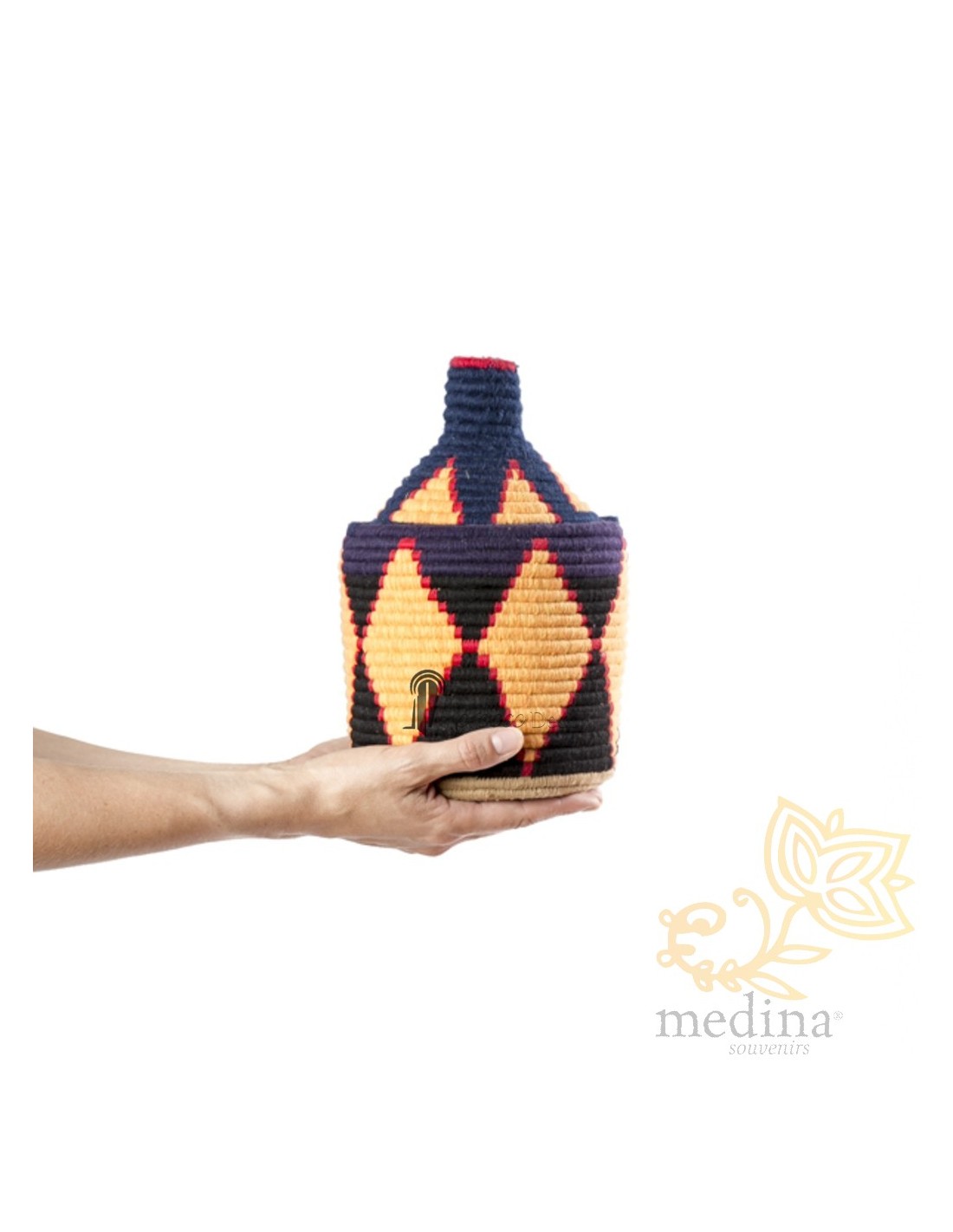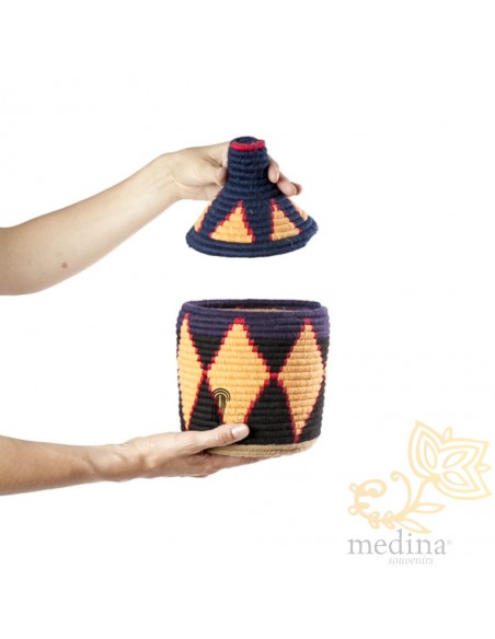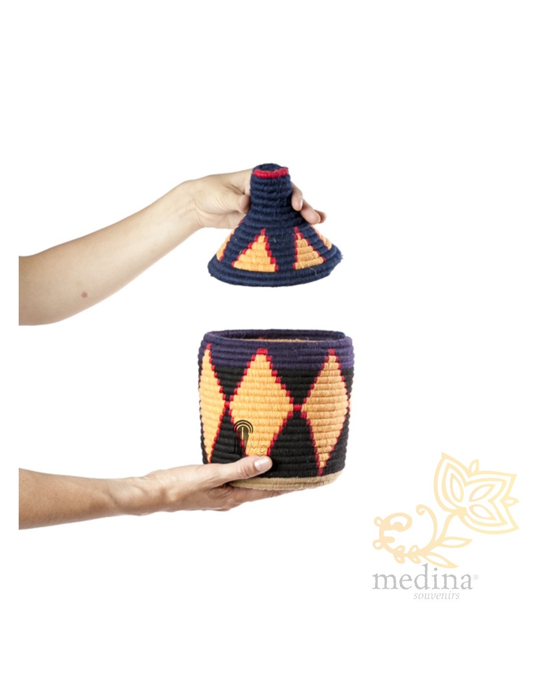 Boîte traditionnelle marocaine communément utilisée comme panier de stockage et de conservation du sucre, plantes médicinales ou fruits secs. Ces pots aux motifs vintages sont le résultat de longues heures de travail minutieux, un travail artistique exceptionnel.