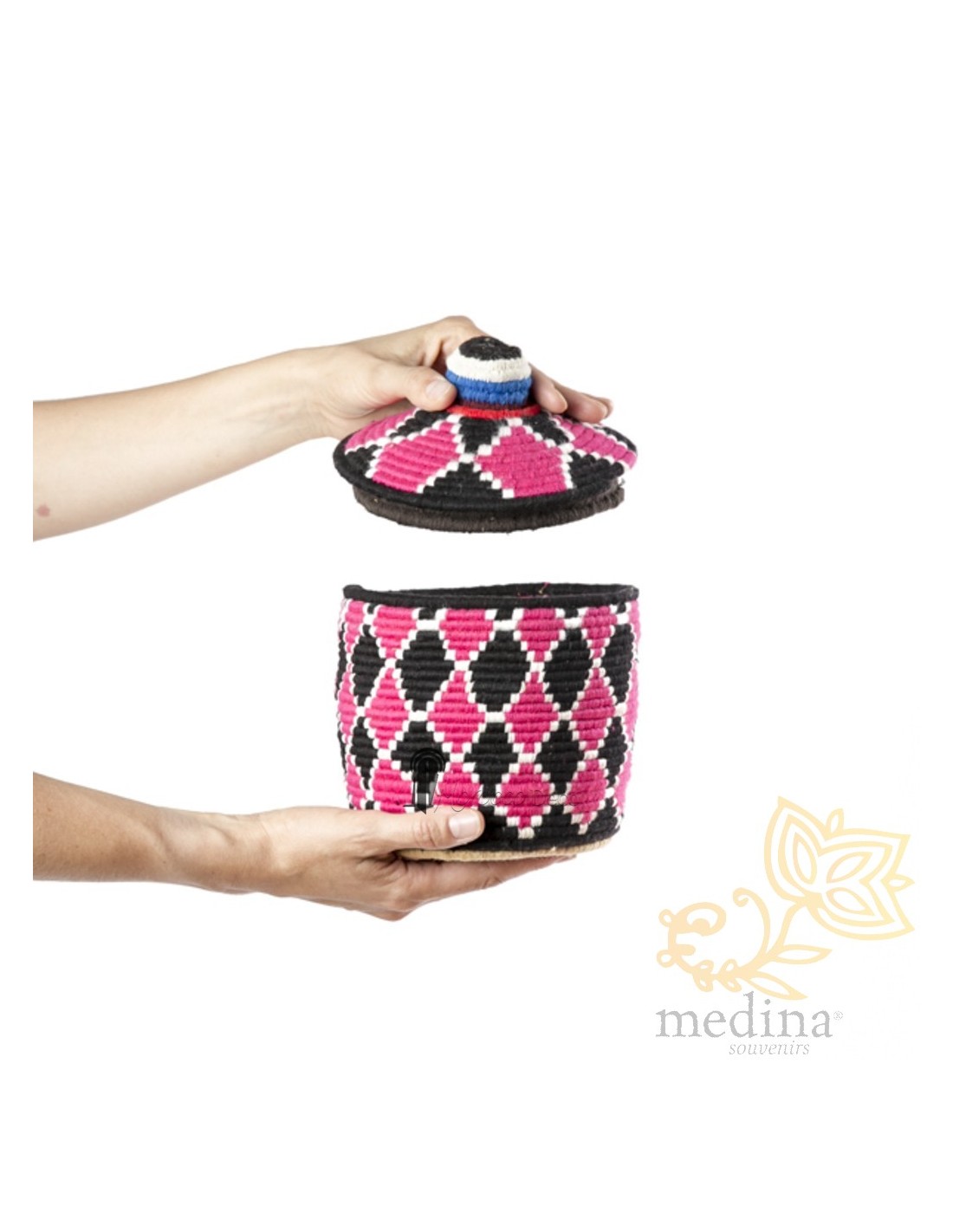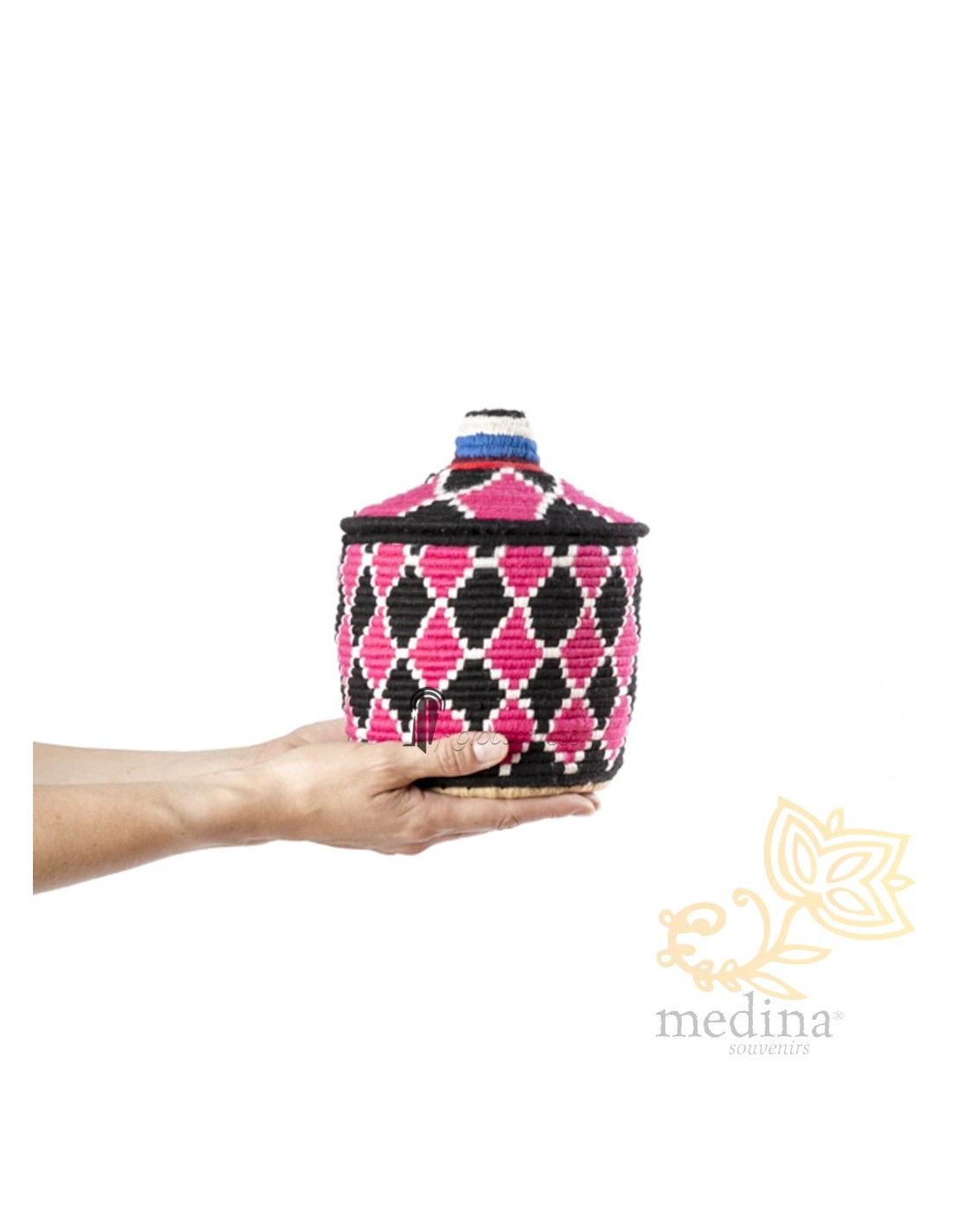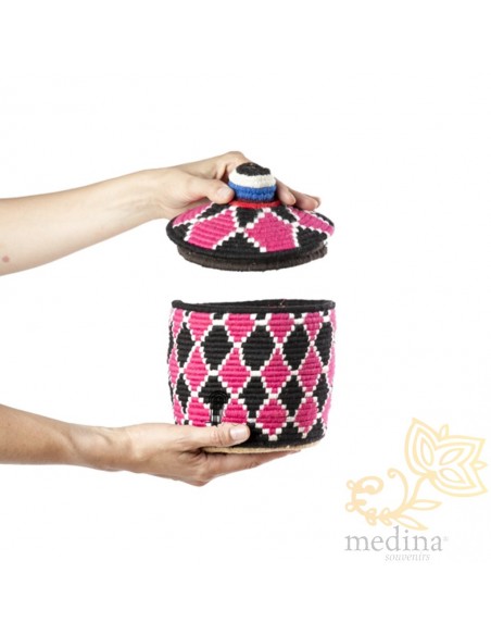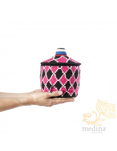 Boîte traditionnelle marocaine communément utilisée comme panier de stockage et de conservation du sucre, plantes médicinales ou fruits secs. Ces pots aux motifs vintages sont le résultat de longues heures de travail minutieux, un travail artistique exceptionnel.