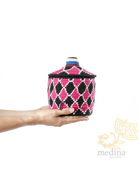 Chaque boite est constituée de roseaux assemblés et tissés de fils de laine dans les tons noir et rose. Un travail créatif qui n'a de limite que celle l'imagination de l'artisan. Une boite robuste aux motifs sympathiques et agréables, résultat d'un savoir faire unique.