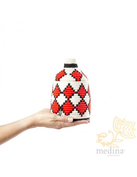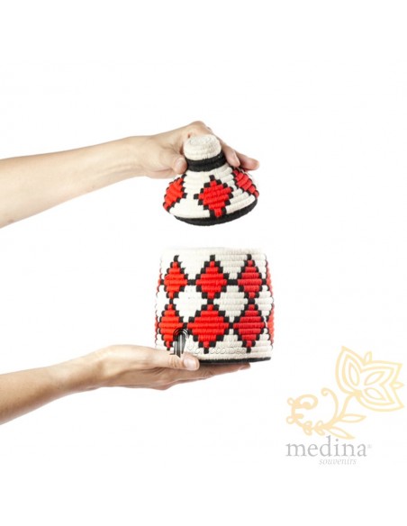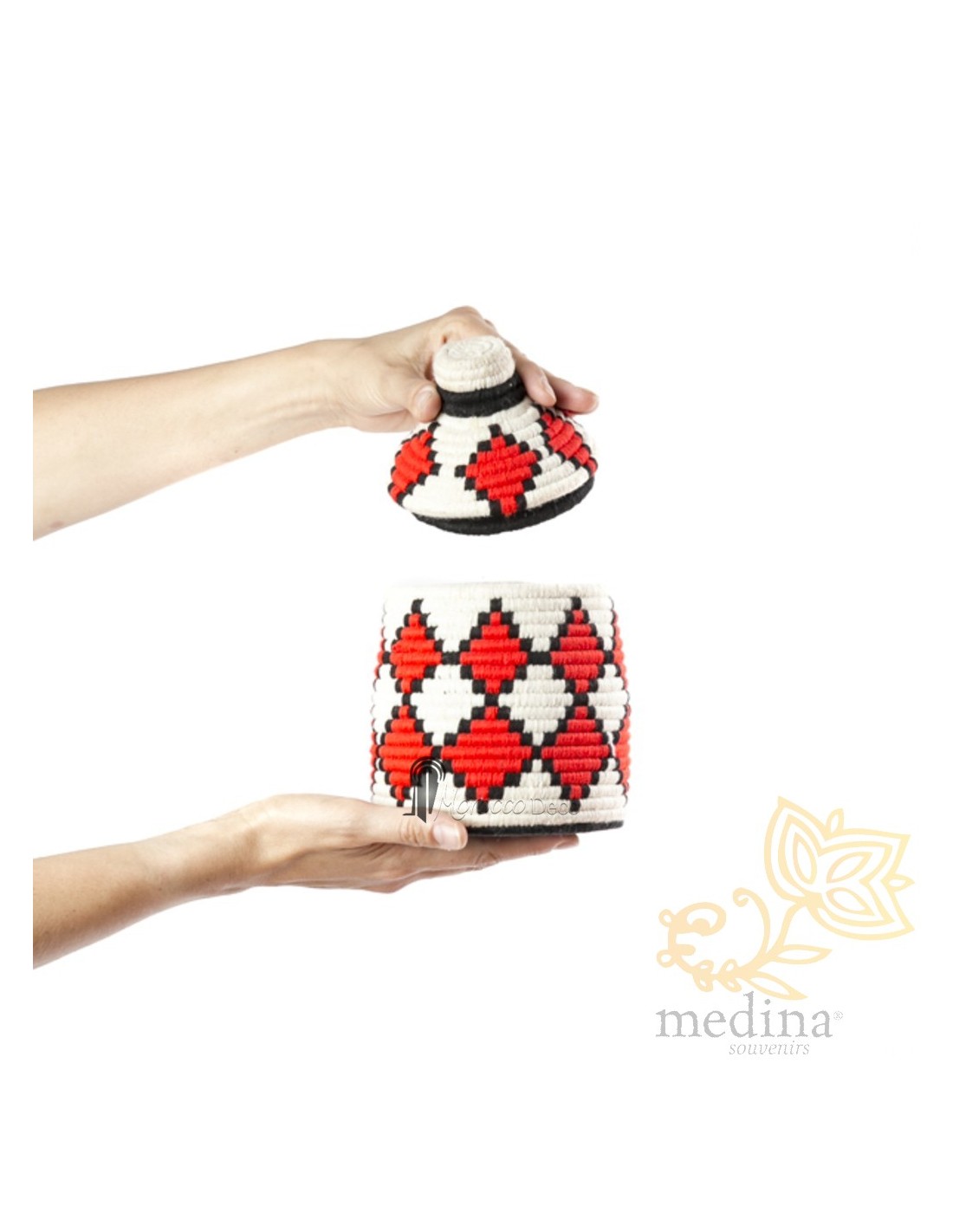 Exclusivement réalisé par les nomades Touareg dans le respect de la tradition orientale. Boites en osier tissées au fil de laine 100% laine avec différents motifs selon l'inspiration de l'artisan.