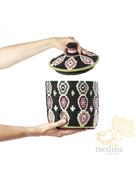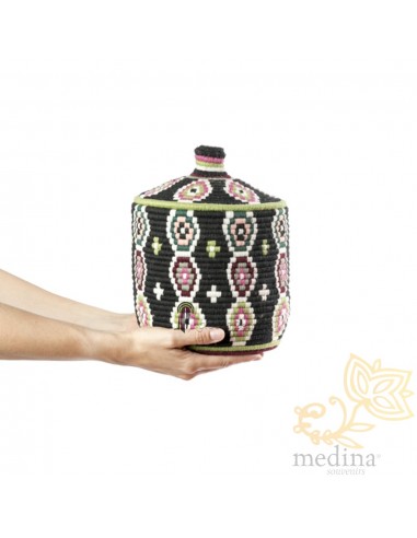 Boîte traditionnelle marocaine communément utilisée comme panier de stockage et de conservation du sucre, plantes médicinales ou fruits secs. Ces pots aux motifs vintages sont le résultat de longues heures de travail minutieux, un travail artistique exceptionnel.