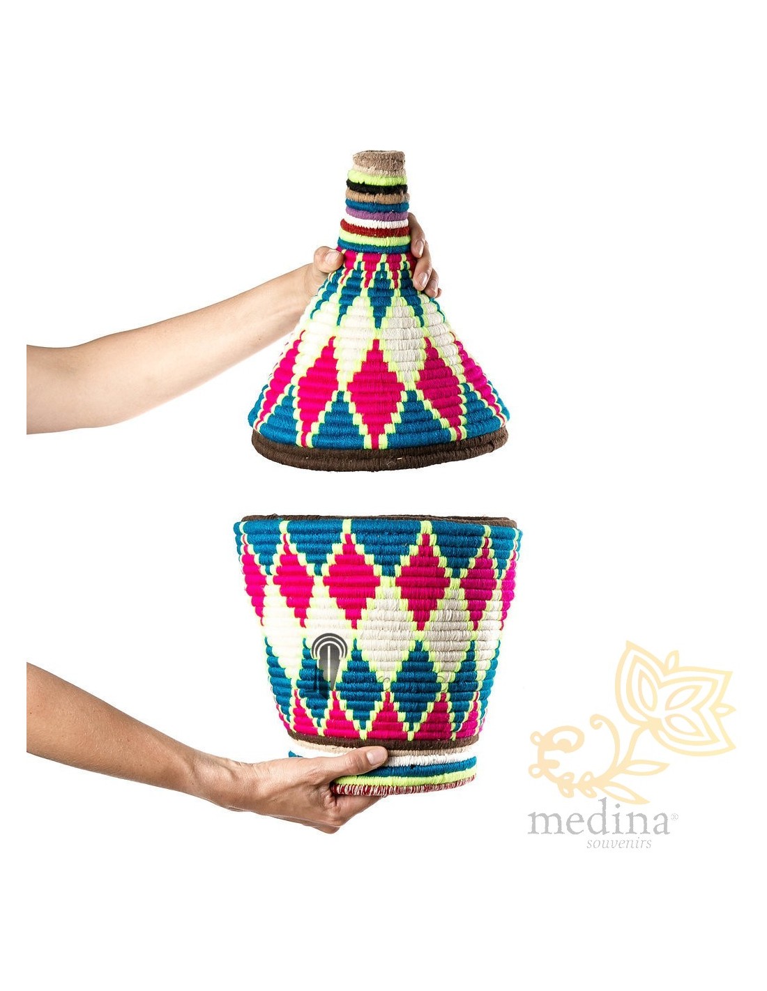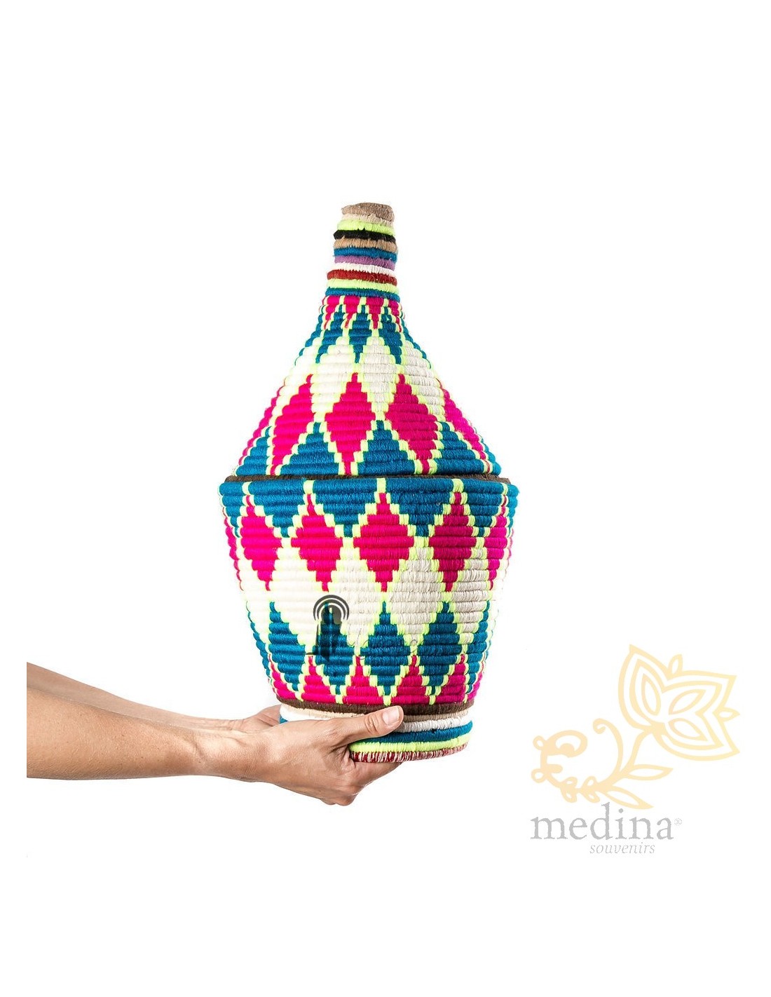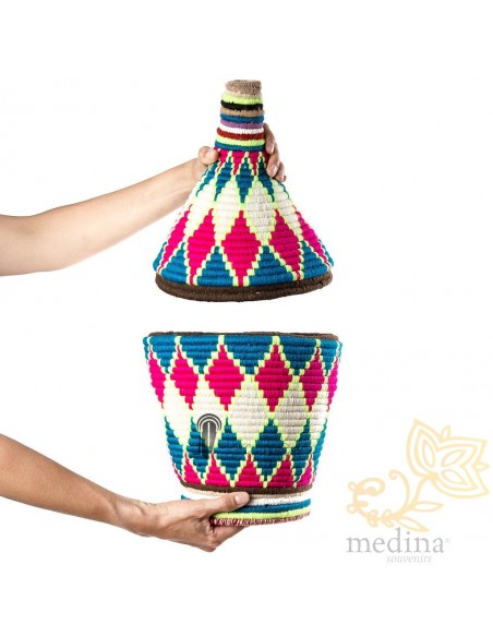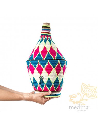 Grande boîte traditionnelle marocaine communément utilisée comme panier de stockage et de conservation du sucre, plantes médicinales ou fruits secs. Ces pots aux motifs vintages sont le résultat de longues heures de travail minutieux, un travail artistique exceptionnel.